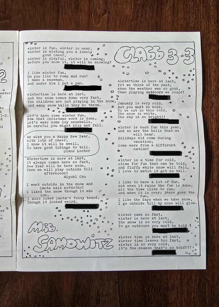 Nannie (my grandmother, my biological father’s mother) was proud of it, though, and kept the thin little booklet containing my “stupid poem”, passing it on to me along with some other treasures she had accumulated over the years. It’s almost as if she knew it would be important someday! Well, it turned out to be important to me, anyway. The cover art on the booklet was drawn by one of my two best friends at the time, Miyuki Oku (Cheryl Wong, being the other), and that booklet is the only memento I have left of my childhood with them. The three of us were inseparable, and I often think of them, wondering if I ever cross their minds the way they do mine.
